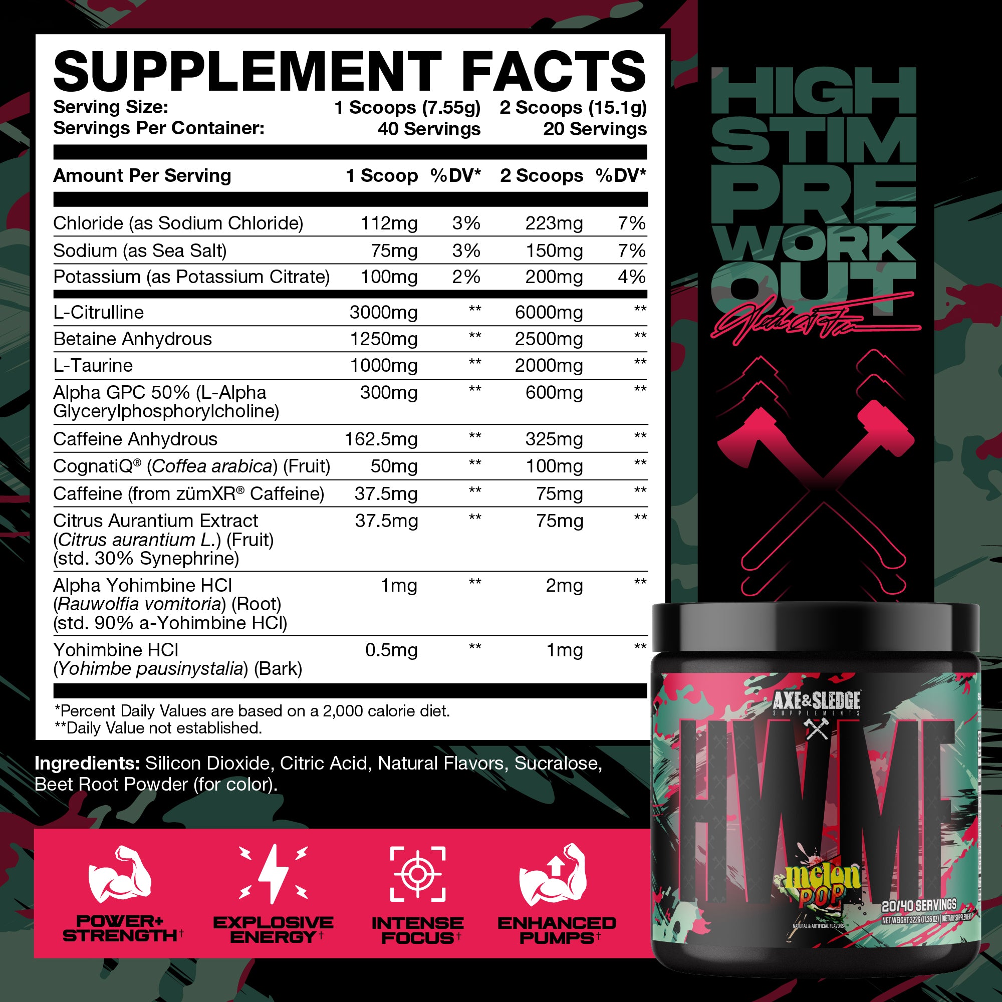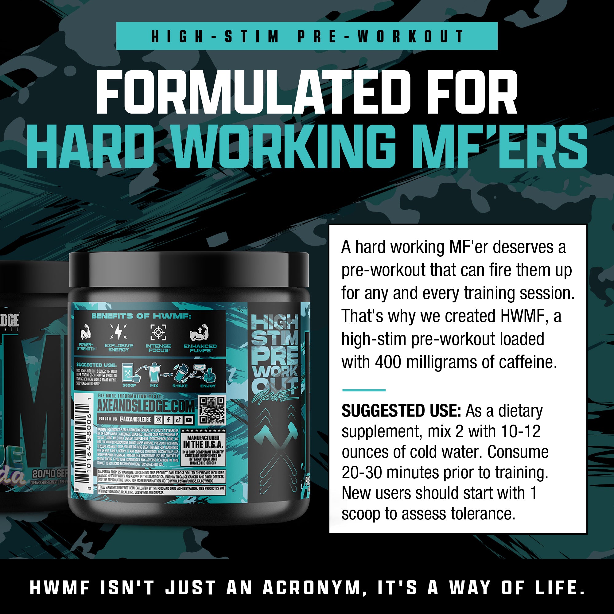Loaded with 400 milligrams of caffeine, HWMF also contains 6 grams of pure L-Citrulline for juicy pumps, 2.5 grams of Betaine Anhydrous for improved strength and power, 600 milligrams of Alpha-GPC, and 100 milligrams of Cognatiq® for dialed-in focus.