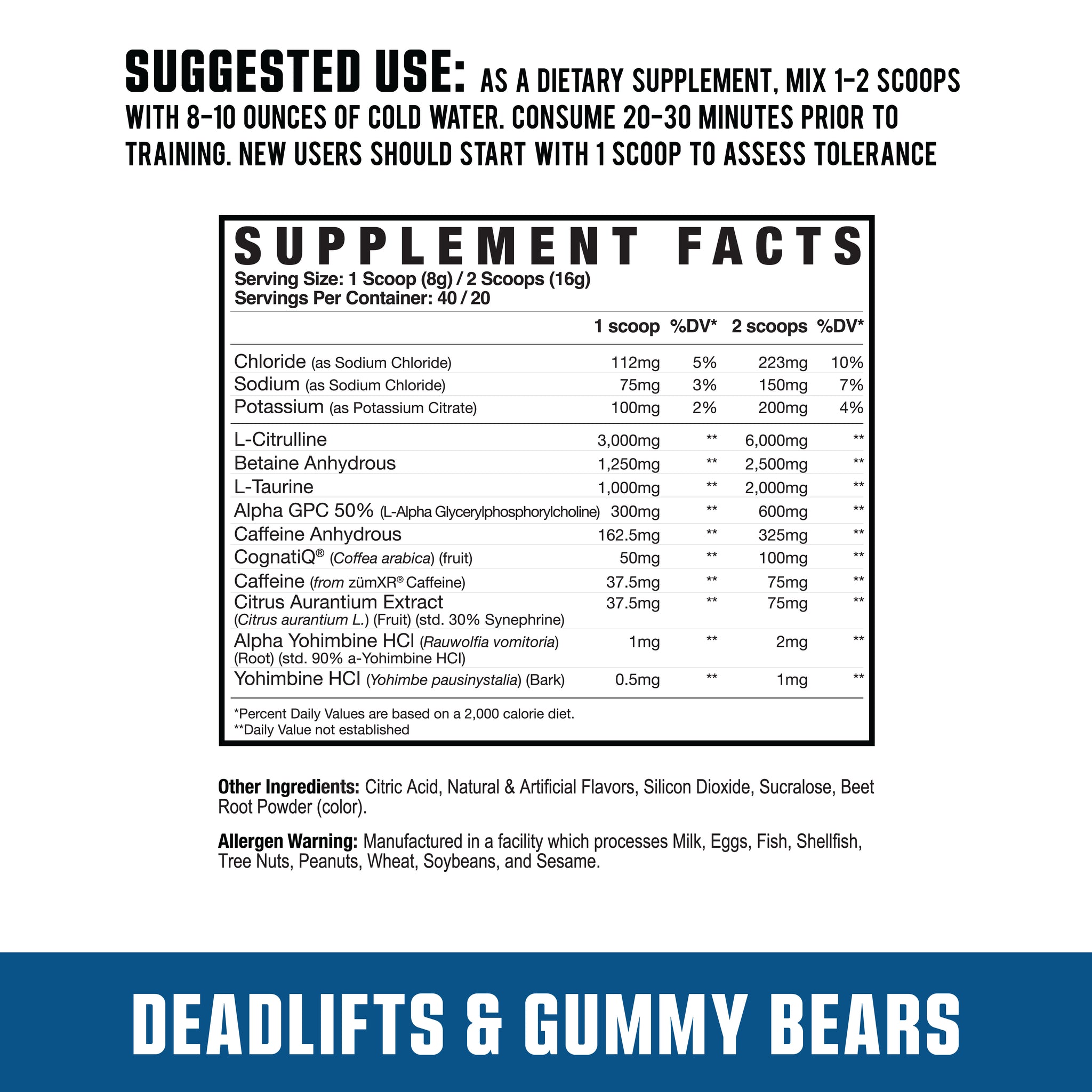 As a dietary supplement, mix 1-2 scoops with 8-10 ounces of cold water. Consume 20-30 minutes prior to training. New users should start with 1 scoop to assess tolerance.